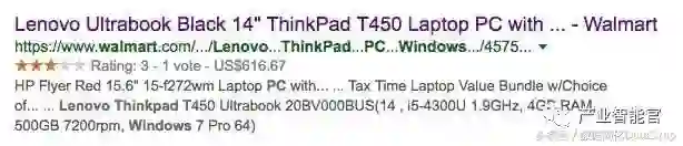 下面介绍Google另外一个利用知识图谱的项目叫“Google Rich Snippets”(Google富摘要)。搜索引擎在搜索结果的页面中会为每一篇搜索结果提供一个目标网页的摘要,以便用户判断是否是自己想搜索的页面。通常网页的摘要是采用“抽取式”方式生成的,即从网页的页面文本中找到和搜索关键词相关的并且比较重要的句子来构成页面的摘要返回给用户。但是Google的富摘要产品中,会抽取在用户HTML页面中以结构化形式存在的知识图谱数据,例如描述实体的属性的数据。目前这方面的标准有包括RDFa, Microdata和Schema.org等结构化数据标签。假设用户想在搜索“Thinkpad T450”产品,在Google返回的Walmart(沃尔玛)线上商店的页面摘要(如图7所示)中,摘要中包含了这个产品的打分(Rating 3星),评论数目(Vote 1份评论)和商品的价格(616.67 美金)。实际上这些重要的数据,用户已经通过Schema.org等结构化的语义标签在HTML中标示出来了,搜索引擎可以通过解析器(Parser)解析出这些结构化数据,利用这些结构化知识图谱数据来产生摘要。我们在图6中展示了利用Google的结构化测试工具,可以从上述沃尔玛产品页面的HTML中抽取上面提到的商品的价格和商标等属性信息。