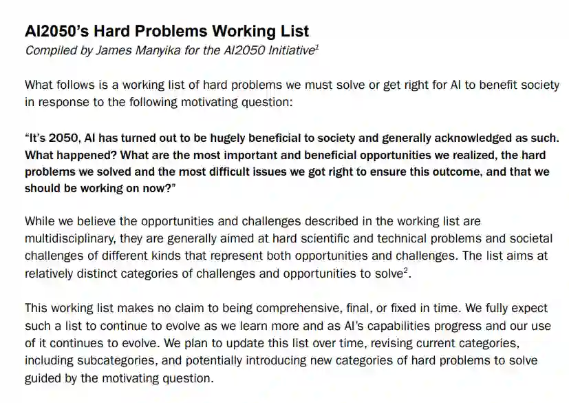 他表示,AI 2050设立的初衷就是要解决这些基本问题。目前第一份「问题清单」已经公布。