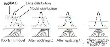 一个简单的例子如下图所示:假设在训练开始时,真实样本分布、生成样本分布以及判别模型分别是图中的黑线、绿线和蓝线。可以看出,在训练开始时,判别模型是无法很好地区分真实样本和生成样本的。接下来当我们固定生成模型,而优化判别模型时,优化结果如第二幅图所示,可以看出,这个时候判别模型已经可以较好的区分生成数据和真实数据了。第三步是固定判别模型,改进生成模型,试图让判别模型无法区分生成图片与真实图片,在这个过程中,可以看出由模型生成的图片分布与真实图片分布更加接近,这样的迭代不断进行,直到最终收敛,生成分布和真实分布重合。