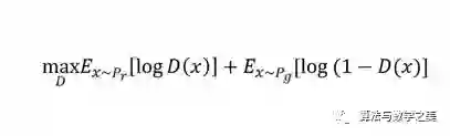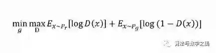上述这种博弈式的训练过程,如果采用神经网络作为模型类型,则被称为生成式对抗网络(GAN)。用数学语言描述整个博弈过程的话,就是:假设我们的生成模型是g(z),其中z是一个随机噪声,而g将这个随机噪声转化为数据类型x,仍拿图片问题举例,这里g的输出就是一张图片。D是一个判别模型,对任何输入x,D(x)的输出是0-1范围内的一个实数,用来判断这个图片是一个真实图片的概率是多大。令Pr和Pg分别代表真实图像的分布与生成图像的分布,我们判别模型的目标函数如下:
