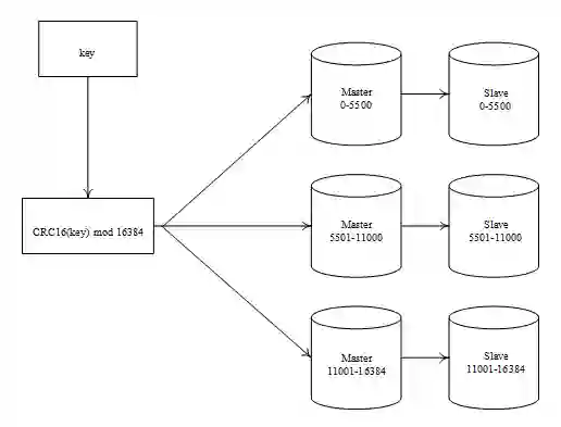 首先,我们来学习Redis的集群分片机制。Redis使用CRC16(key) mod 16384进行分片,一共分16384个哈希槽,比如若集群有3个节点,则我们按照如下规则分配哈希槽: