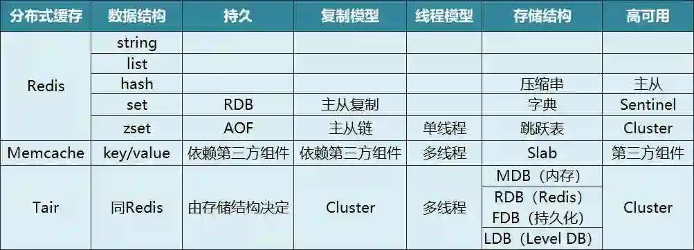 常用的分布式缓存包括Redis、Memcached和阿里巴巴的Tair(见下表),因为Redis提供的数据结构比较丰富且简单易用,所以Redis的使用广泛。