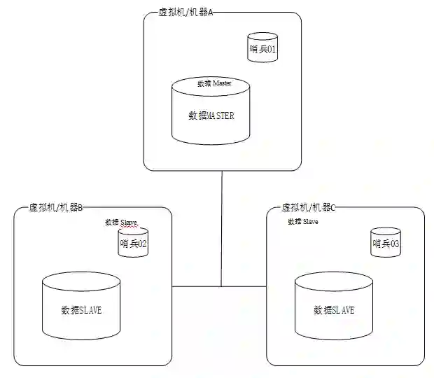 这里给出一个哨兵的通用部署方案。哨兵节点一般至少要部署3份,可以和被监控的节点放在一个虚拟机中,常见的哨兵部署如图所示。