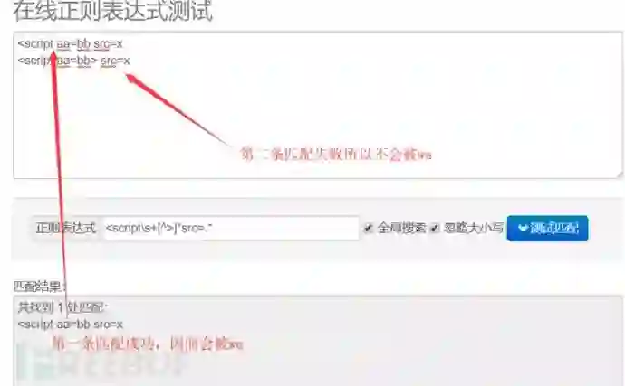 <script\s+[^>]*src=.* (注意实际的正则可能特别复杂,这里是简化版的,没有考虑一些特殊字符,比如字母和数字可能可以互换,还有一些特殊字符,空格等等,这里能大致描述清楚waf的正则表达式的主要结构就可以了,下面出现的正则表达式同理) 。