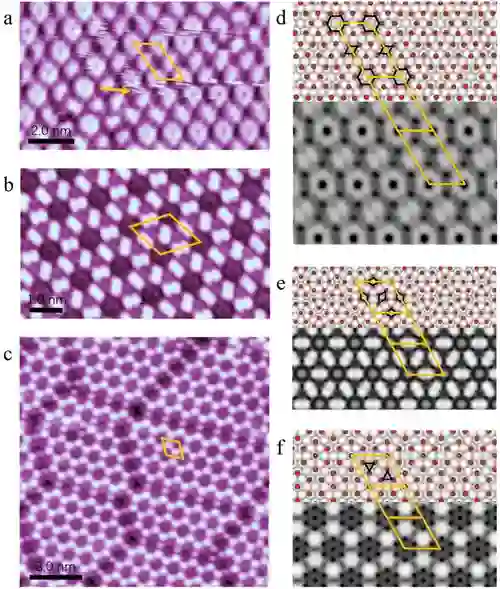 图. (a, b) 分别对应于在77K温度下共存且能相互转化的CO液态晶体相α和β; (c)α和β相降温到5K后相变得到的新的CO固体晶体相γ。(d-f) 分别对应α、β和γ相理论计算的原子结构模型和STM模拟图像。a-f各图中的平行四边形和菱形分别表示各个相的原胞。