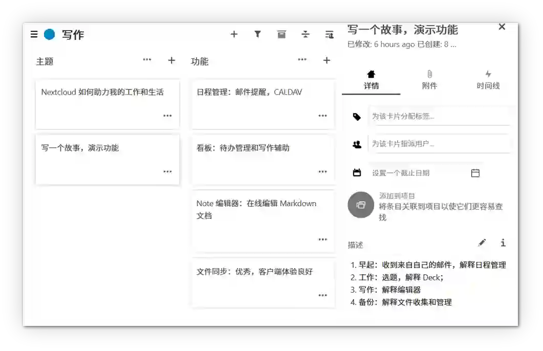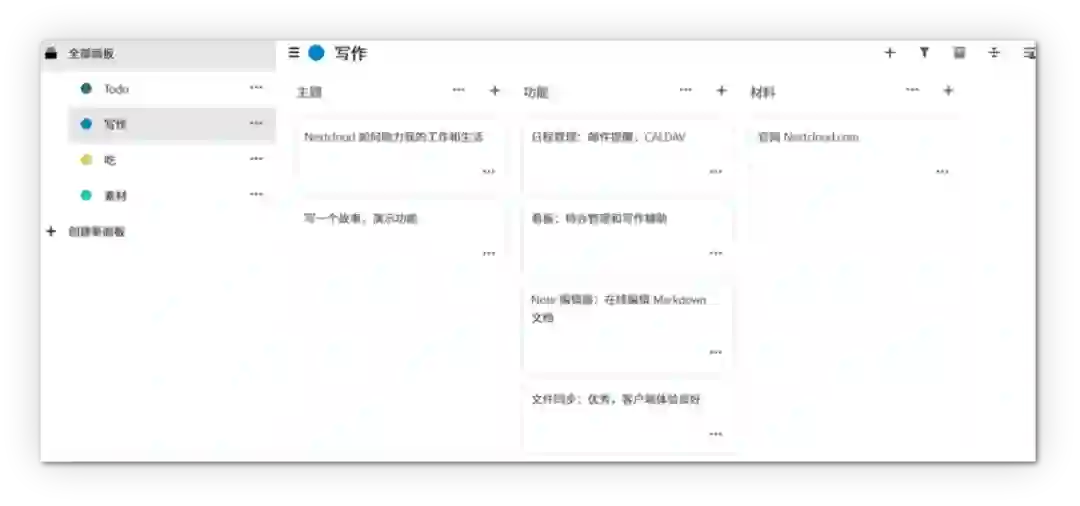 查看了今天的日程安排,解决完了早餐,之后就该上班了。上午处理完各种杂事和一些临时任务,准备拟定几个选题和文章大纲并提交,这就该 Deck 这款 Nextcloud 应用出场了。Deck 运行在 Nextcloud 上的一个类似于 Trello 的简单看板应用。应用大致分为三级,面板 - 列表 - 卡片,可以用来做灵感收集,文章构思,以及任务管理。