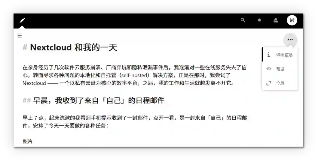 自己用的几款软件出现了云服务崩溃、厂商弃坑和隐私泄漏问题后,我逐渐对一些在线服务失去了信心,转而寻求各种问题的本地化和自托管(self-hosted)解决方案,正是在那时,我尝试了 Nextcloud —— 一个以自托管云盘为核心的效率平台,之后,我的工作和生活就越发离不开它。