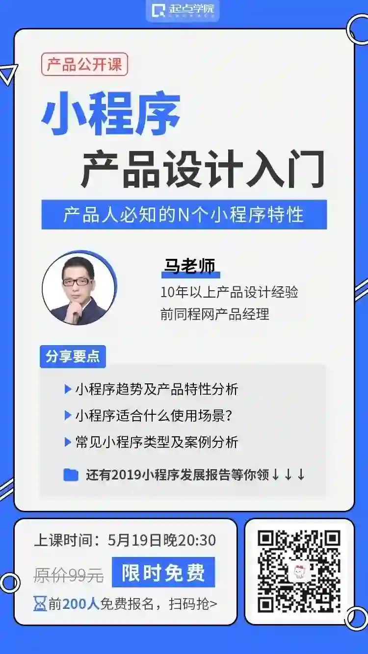 基于以上问题,起点学院特邀业内资深产品老司机@马老师,带你0基础入门小程序产品设计,拆解——