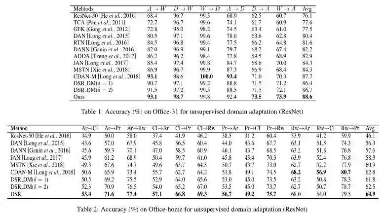 从实验结果来看,DSR 在数据集 Office-Home 的大多数迁移任务上优于其他Baseline,尤其显著提升了硬迁移任务的分类精度,但在 W→D 和 A→D 任务上的结果低于一些比较方法,这是因为域中的样本数量过少导致 DSR 模型不足以重建可解耦的语义表示。