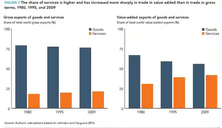 《报告》以专章揭示了服务贸易和全球价值链的关系。经济学家将许多服务称为“非贸易品”,这意味着它们不能在国际上直接进行交易。高端服务,如医疗保健和法律咨询也很难直接进行国际贸易。这一情况随着远程服务交易的出现而有所改变,但从统计数字上来看还很小。然而,从增加值的角度来研究贸易问题时,服务贸易的比重从1980年到2008年几乎增加了50%。一种解释是,制成品的价值大部分来自服务业的投入。