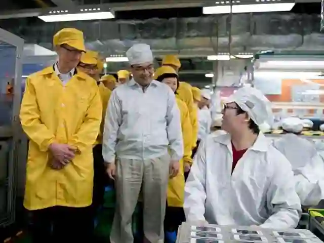 ▲2012年3月,苹果CEO蒂姆·库克(Tim Cook)参观位于富士康郑州科技园工厂的iPhone生产线