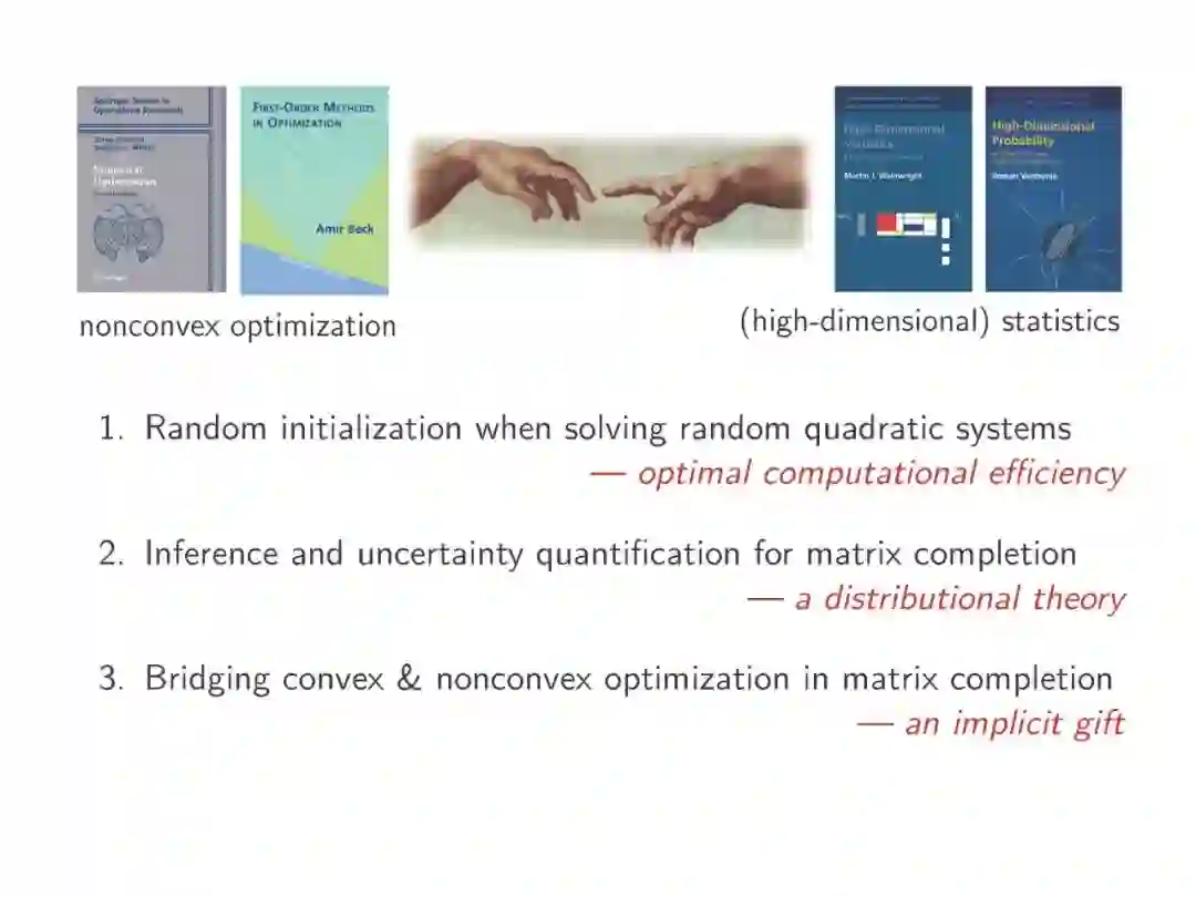 近年来,利用非凸优化方法来解决统计估计和学习问题的研究工作层出不穷。由于非凸优化算法易受虚假局部极小值的影响,传统工作通常对其持悲观看法,而简单的迭代方法,如梯度下降法,在实践中已经取得了显著的成功。然而,直到最近,这些理论基础在很大程度上一直缺乏。这个报告展示了两个最近关于非凸统计估计的故事,它们强调了统计模型在实现有效的非凸优化中的重要作用。第一个故事是关于一个相位检索问题的随机初始化非凸方法:即使没有仔细的初始化,像梯度下降这样的简单算法也可以在对数迭代次数内找到全局解。第二个故事是关于非凸低秩矩阵补全的不确定性量化。我们在非凸估计的基础上开发了一个去偏估计器,使未知矩阵缺失项的置信区间能得到最优构造。所有这些都是通过一个“一留一出”的统计分析框架实现的,该框架在处理和解耦复杂的统计依赖方面非常强大。