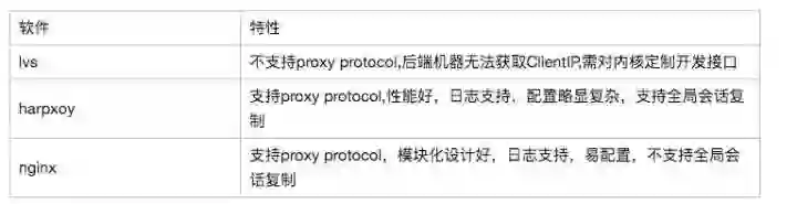 主要调研了lvs/haproxy/nginx这三种开源产品在四层负载方面功能特性,新LB方案水平扩展相对容易,选型阶段主要考察功能支持情况,情况如下: