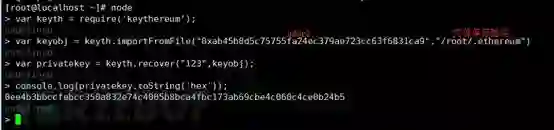 10. 获取账户addr1的私钥(这里也是我踩过的一个坑,刚开始以为私钥就是keystore路径下的对应UTC文件中的“ciphertext”的值,导致解决问题的方向出错,浪费了很多时间,甚至差点放弃,后来由于刷新了一下发际线高度,发现了问题所在。)