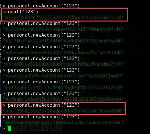 3. 刚创建私有链时,是没有一个账户的,我们使用“personal.newAccount(“123”)”命令生成新的账户。多次生成账户,直到生成我们需要的账户地址(地址末尾有两个0,目前猜测是必须要是2的倍数,因为我使用1个0的进行测试,没有成功,但是3个或以上的地址实在是太难生成了,全看运气,所以就没测试)值得注意的是,我一开始的时候密码使用的是“1”而不是“123”,但是生成了将近200个账户都没有结尾是两个0的账户(很多次尝试,也浪费了不少时间),网上有些人说理论上生成256个账户,就会有一个结尾为“00”的。我尝试了使用密码“123”后,很多次都是在10个账户以内或者稍多一些就生成了“00”结尾的账户,不知道究竟是什么原因。毕竟是玄学。