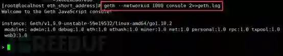 因为直接使用“geth console”开启终端的话,其日志等等一些信息会不断的刷新,严重影响我们输入命令,所以我们使用“geth —networkid 1000 console 2>>geth.log”将日志信息输出到本路径下geth.log文件中, —network参数指定我们所要连接的私有链的ID,即我们之前在genesis.json文件中的“chainId”