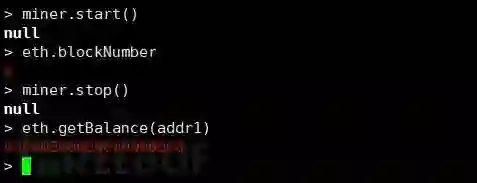 5. 接下来就是部署合约了,但是部署合约之前需要挖矿,因为现在每个账户都没有钱,而部署合约是需要花钱的。所以使用“miner.start()”开始挖矿,为确保挖矿正常进行,使用“eth.blockNumber”查看区块的数量是否变多,也可以使用“eth.getBalance(addr1)”来查看账户中是否有以太币,单位wei。“miner.stop()”停止挖矿。