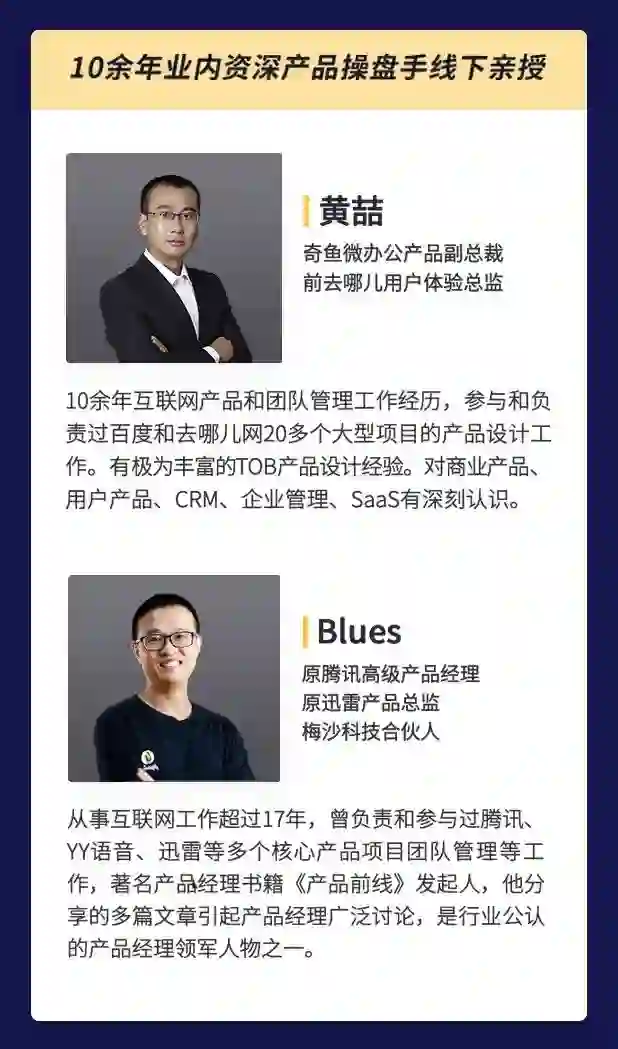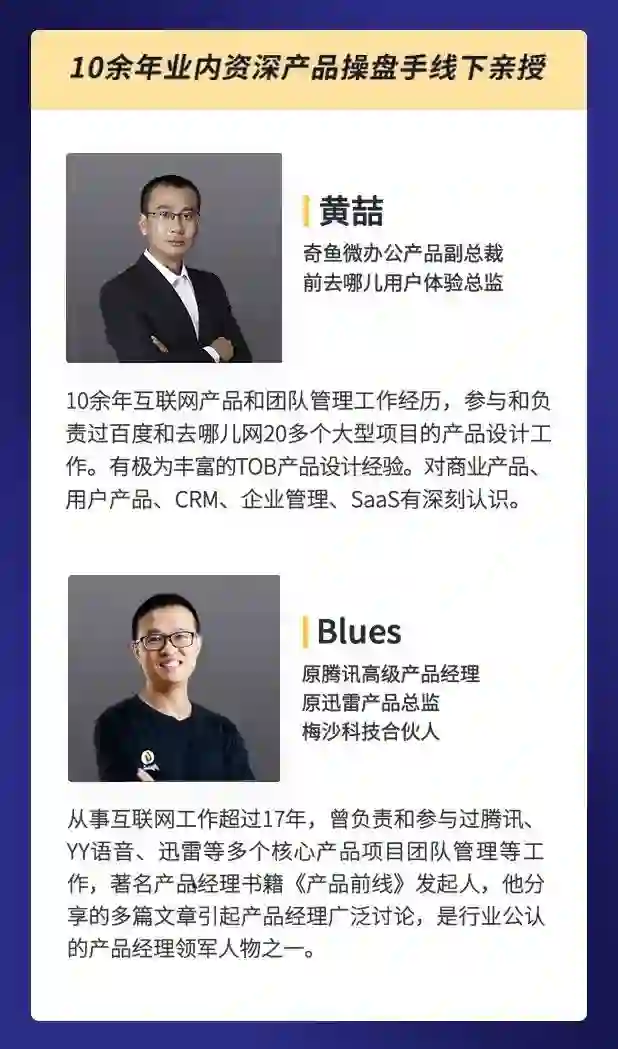 事实求是地说,黄喆和Blues老师是产品领域内,为数不多的,依旧在一线的实战派导师;《产品管理者进化营》也绝对是业内物超所值的、实用的学习+咨询会。