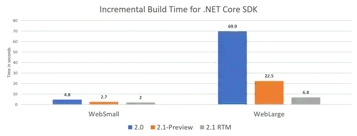 下图是.NET Core新老版构建时长的对比。可以看到较大的项目,其构建时长能节省一倍多,估计正式版本还会进一步优化。