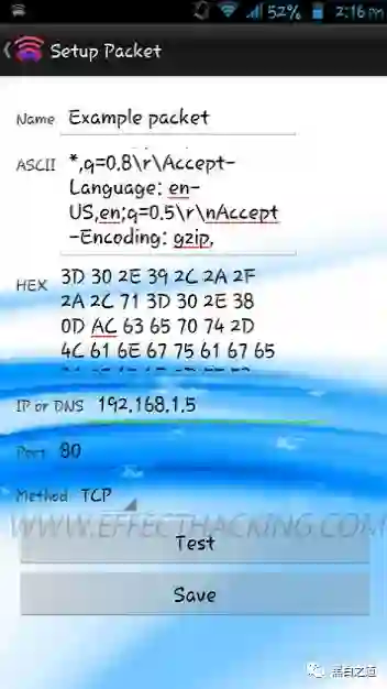 3.点击“测试”按钮。数据包发送方将数据包发送到目标IP。