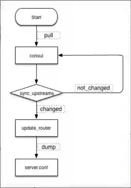 Upsync,开发了模块 nginx-upsync-module,它的功能是拉取 consul 的后端 server 的列表,并更新 Nginx 的路由信息。此模块不依赖于任何第三方模块。consul 作为 Nginx 的 db,利用 consul 的 KV 服务,每个 Nginx work 进程独立的去拉取各个 upstream 的配置,并更新各自的路由。