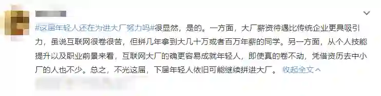 恰巧前段时间,#这届年轻人还在为进大厂努力吗?#话题冲上热搜,本以为处于舆论风口浪尖的大厂会让很多人望而却步。而事实却与之相反,通过身边朋友以及社交平台网友发言来看,哪怕风波不断,大厂也依然是大多数年轻人的第一选择。