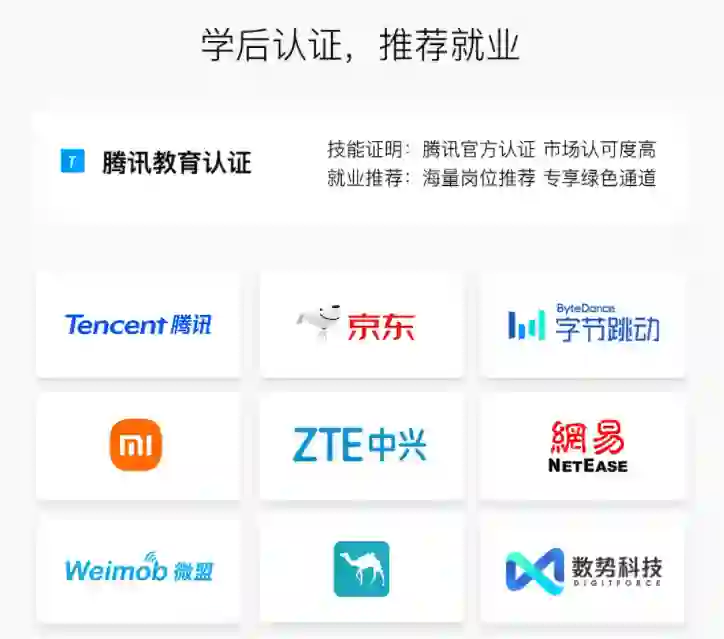 腾讯课堂也会针对学员学后进行认证考试考评,并联动腾讯系生态企业,对符合要求的优秀学员推荐就业,在就业招聘平台提升学员简历曝光程度,就业涨薪更轻松。
