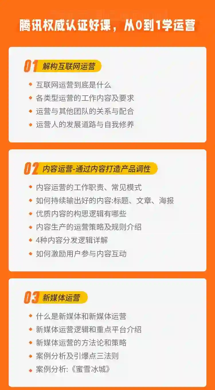 课程是腾讯官方认证的运营好课,内容经过腾讯P12级专家团队严格审核,对标腾讯P6-P8级别运营人能力标准。