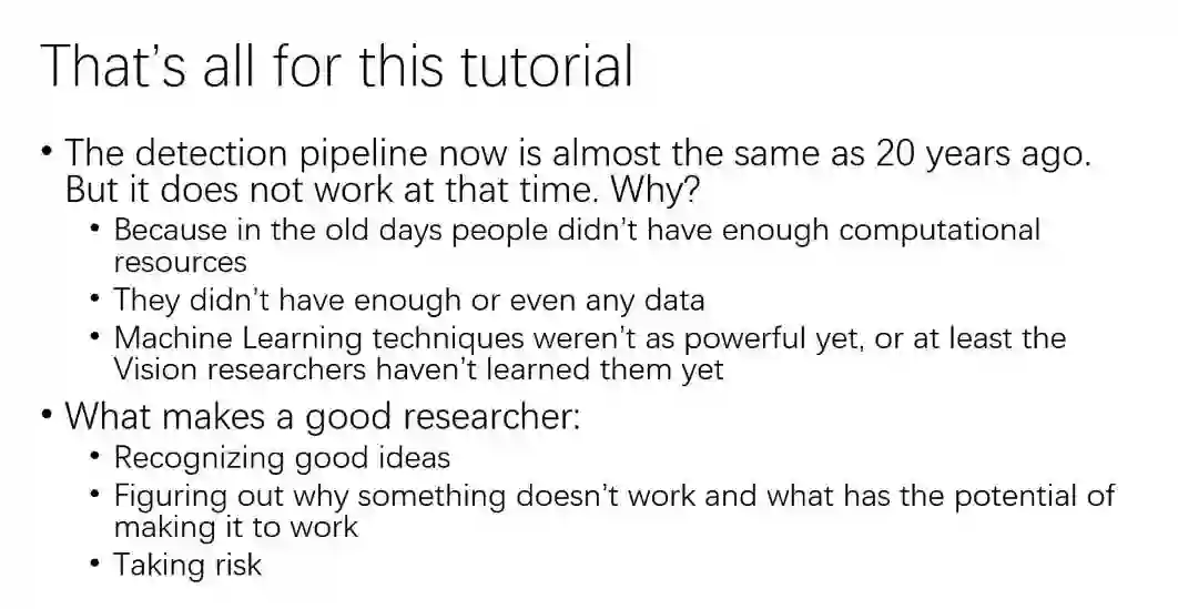 其实物体检测的方法框架,近二十年来并没有太大的变化。以前的方法为什么在当时没有成功呢?因为当时人们并没有那么多的数据和计算资源,所以像深度学习这种计算密集型的数据驱动的方法,在当时完全没有用武之地。而且当数据很小的时候,很多根据数据集的特点专门调优的方法,比起数据驱动的方法更有效。另外,当时的机器学习的工具并不像现在这么丰富和方便,即使有的话,很多做计算机视觉的人也还没学会去用。
