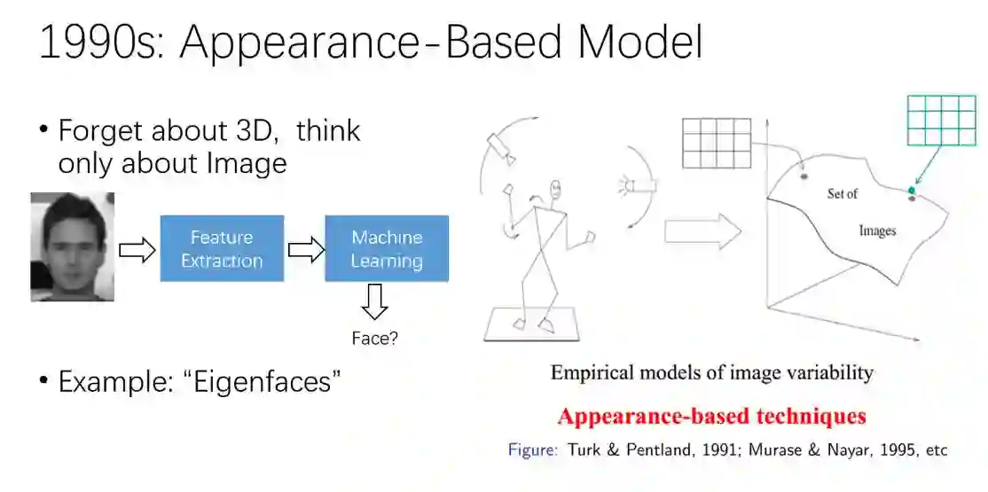 到了九十年代之后,主流的方法是只从图像本身考虑,而不去管物体原来的三维形状。这类方法统一叫做appearance based techniques. 所谓appearance, 从模式识别的角度去描述的话,就是图像特征(feature),即对图像的一种抽象描述。有了图像特征,我们就可以在这个特征空间内做匹配,或者分类。一个最经典的例子,就是”Eigen Faces”方法,这也是90年代做人脸识别最重要的方法之一。它的主要思想是用PCA(主成分分析)去分解人脸数据集,得到特征向量,然后把每一张人脸图像表达为特征向量的组合。这些组合系数,就构成了对人脸图像的抽象描述,即特征。最后我们就可以用特征空间内样本的距离,来判断样本是否是属于同一个人脸:同一个人脸在样本空间内距离很小,不同脸之间距离比较大。
