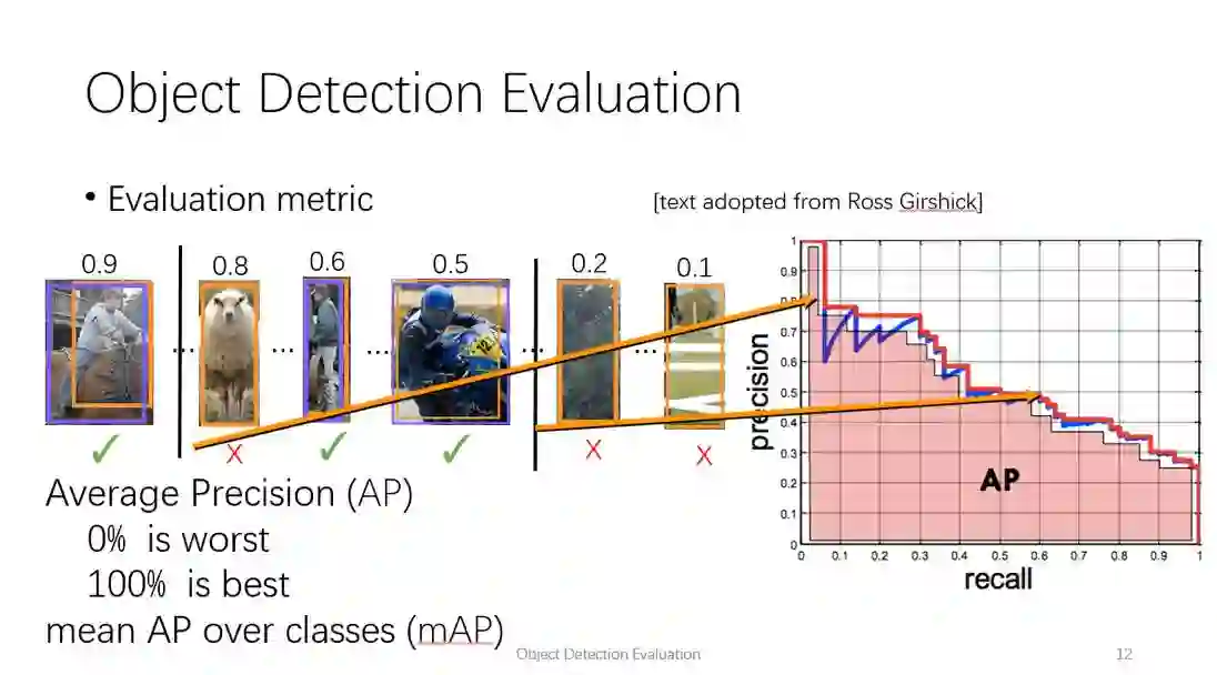 我们还需要定义两个描述指标:precision 和recall。Precision是true positive 数量除以 true positive和false positive的比值,即所有的检测结果中,正确的比例。 Recall 则是所有truepositive的个数和标注框个数的比值,即所有的目标中,被系统检测出来的比例。
