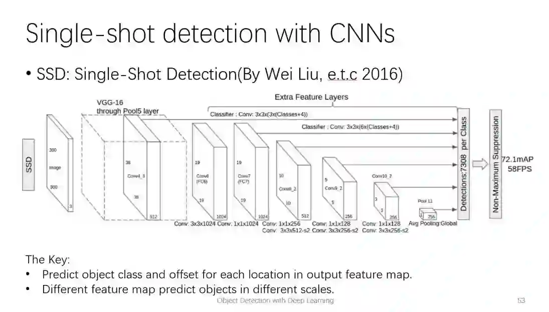 一步到位的方法现在的一些代表工作有YOLO, SSD。现在公司里用的DenseBox也是和SSD类似的一个方法,是我在2014年末还在百度实习的时候做的工作。时间上应该比SSD和YOLO都要早。这里我们就主要讲一下SSD,它在PASCAL VOC数据集上能够达到实时的检测速度,效果也和Faster R-CNN差不多。SSD可以看作是一个强化版的RPN,输出层的每一个像素都代表了一个检测框。和RPN一个输出层不同, SSD会有好几个输出层:比较浅的输出层的分辨率比较高,用来检测小一些的物体,比较深的层检测大的物体。最后再把所有层的检测结果合在一起作为最终的输出。