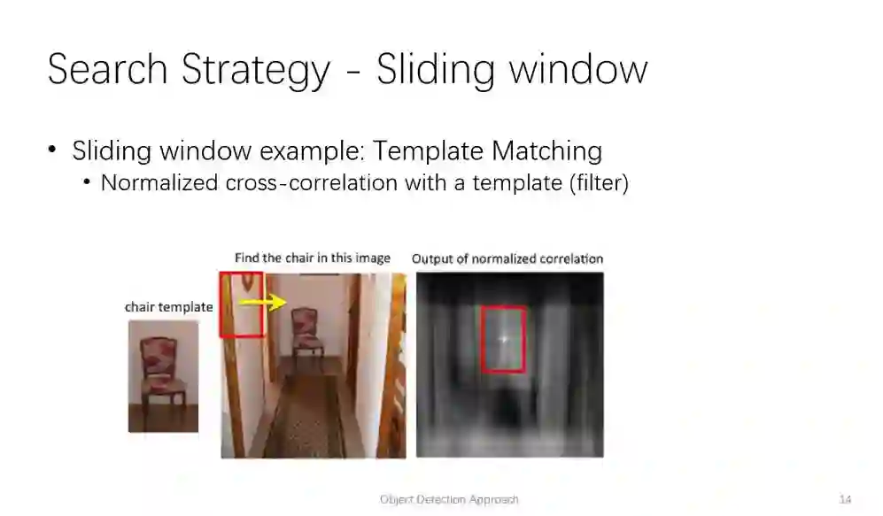 第一种是我把所有可能的位置和大小都列举一遍:我可以通过一个扫描窗口,从图像左上角开始,从左到右,从上到下,一直扫到到右下角,然后我们改变图像的大小,保持扫描窗口大小不变,继续扫。每一个位置和大小,我们都可以后续通过处理得到一个置信度得分,这就是最典型的图像模板匹配的例子。在经典的模板匹配的例子中,扫描窗口所用的模板就是一个图像块,置信度得分的计算方法是correlation。如果当前位置和模板越匹配,那么得分就越大。因此我们能够通过这种方式得到物体的位置。