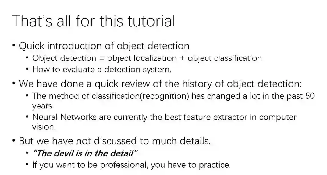 总结一下,今天主要介绍了物体检测的领域,包括物体检测的概念,方法的评估。然后回顾了下图像识别和检测领域五十年来的发展。对于模式识别领域来说,深度学习是最好的提取图像特征的方式,除非硬件受限只能用传统的方法,不然就可以直接用现在最好的深度学习模型去做实验。这里面我们并没有讨论太多具体实现的细节,其实在物体检测领域,对细节的处理直接影响到模型最终的结果。如果你对有兴趣的话,还是建议大家在具体的数据集上去尝试,调参,慢慢地你就会有自己的理解。