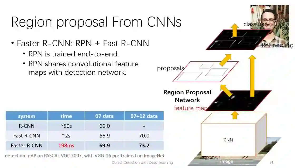 现在我们再看看实际运行中, Fast R-CNN的速度。同样是一张PASCAL VOC数据集的图片,检测网络只需要0.2秒,而之前R-CNN 要达到类似的准确率,需要40多秒!而现在候选区域提取反而成了瓶颈,通常要几百毫秒到数秒的时间,而且这一步的计算也是独立的。后来进一步改进的FasterR-CNN方法引入了一个叫Region Proposal Network(RPN)的结构,解决了这个问题。所谓RPN就是一个CNN,用来预测哪些地方可能有物体,并回归出物体的位置。而且RPN和分类网络共享了图像特征,进一步避免了重复计算。所以FasterR-CNN其实就是RPN加上Fast R-CNN,一整套系统可以端到端进行训练。FasterR-CNN相比于之前的FastR-CNN,检测时间由原来的2秒缩短到0.2秒,使得实时的检测系统成为可能。