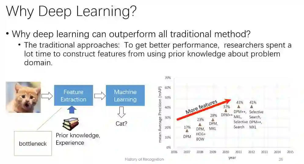 我们以图像分类为例,传统方法需要人为地根据场景和目标去设计合适的图像特征。例如当你需要去对物体的外观进行建模,你可能需要基于梯度的特征去描述轮廓。你还需要想办法对梯度信息进行筛选,量化,得到相对稳定的表达。而这些所有的工作,都需要有一定的领域知识去设计和调优。从PASCAL VOC数据集物体检测方法的发展来看,更好的特征对最终的效果起到决定性作用。