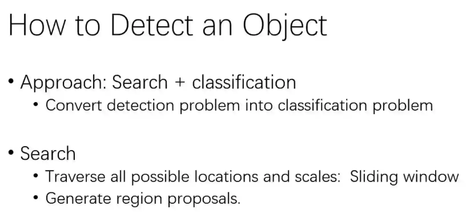 我们再讲讲如何去做物体检测?其实很简单,典型的一个思路就是,我去搜索所有可能的位置。然后再去对这些所有可能的位置进行分类,看看它是不是包含这个物体。所以,我们把这个问题分解成两个步骤,第一步是去找目标的位置,第二步就是去做一个置信度分类。