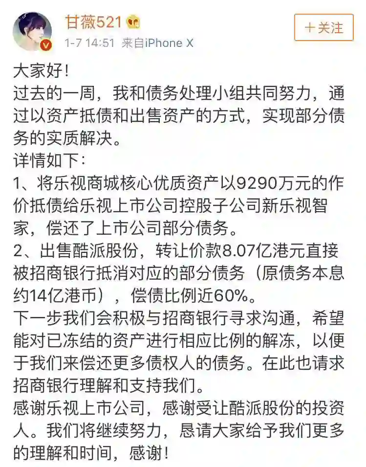 1月7日,甘薇又在微博写道:“我和债务小组共同努力,通过以资产抵债和出售资产的方式,实现部分债务实际解决,以便偿还更多债权人的债务。”