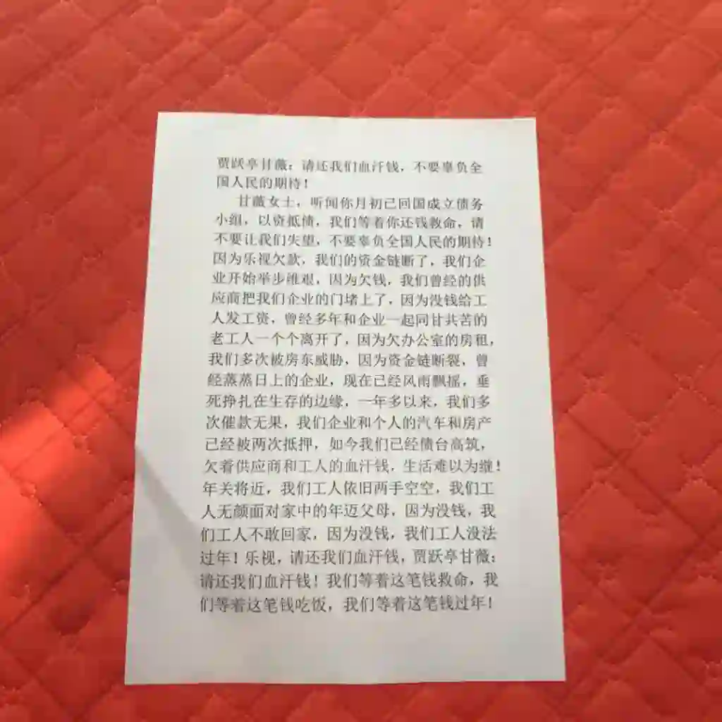 乐视,请还我们血汗钱,贾跃亭甘薇:请还我们血汗钱!我们等着这笔钱救命,我们等着这笔钱吃饭,我们等着这笔钱过年!
