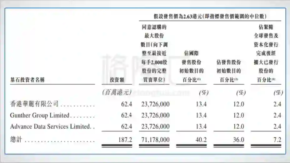 三位分别通过香港华丽有限公司(赵勇)、Gunther Group Limited(邢李㷧)、Advance Data Services Limited(马化腾)认购希玛的国际发售股份。按低位数发行价2.35港元、中位数2.63港元、高位数2.90港元来计算,各基石投资者认购国际发售股份2655.2万股(占发售股份的13.5%)、2372.6万股(占发售股份的12%)、2151.6万股(占发售股份的10.9%),各按发售价认购总额为6240万港元的国际发售股份,总共约1.87亿港元。(下图为中位数2.63港元的各基石投资者的持股比例)