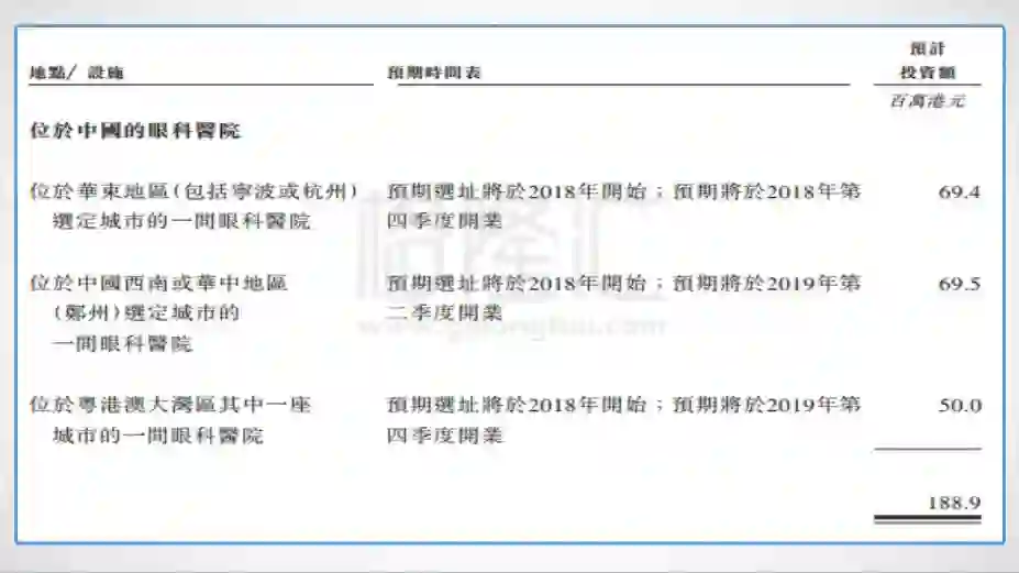 (2)40.4%的净额(约1.89亿港元)用于在国内开设三间眼科医院。公司计划分别在华东(宁波或杭州)、西南或华中地区(郑州)、粤港澳大湾区设立眼科医院;