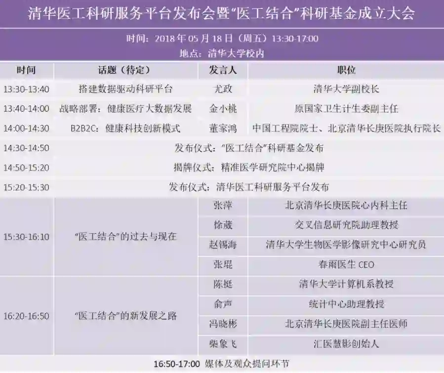 清华大学精准医学研究院将联合数据科学研究院于2018年05月18日举办“清华医工科研服务平台发布会暨医工结合科研基金成立大会”,邀请国家相关部委领导、数据科学领域的研究学者、医疗工作一线的实务人员共同参会。