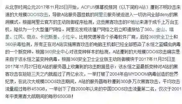 从北京时间公元2017年11月25日开始,ACFUN弹幕视频网(以下简称A站)遭到不明攻击来源的大规模DDOS攻击,导致A站服务器挂载的阿里云服务被迫进入一切访问全部deny的黑洞模式。根据阿里云官方的主动防御程序检测,这些黑客攻击的IP地址来源于成千上万台主机,疑似为一个大型僵尸网络。阿里云发现该僵尸网络之后立即通报给了360、金山、瑞星、江民、微点、卡巴斯基、小红伞、比特梵德等各个杀毒软件厂商,后经360安全卫士和360杀毒检测,所有正在对A站实施黑客攻击的电脑主机都已经全部感染了永恒之蓝蠕虫病毒的一个新变种。根据360安全中心对该变种样本的检测,A站遭到的大规模DDOS攻击确实是来自于该永恒之蓝变种病毒。根据360安全卫士企业版主动防御模块于2017年11月25日至2017年11月27日在A站的服务器上收集到的攻击数据显示:该永恒之蓝最新变种对A站的黑客攻击在短短三天之内就超过了两亿余次,一举打破了2004年由MYDOOM病毒创造的世界纪录,在此次大规模DDOS攻击期间,A站的服务器每秒遭到300多万次黑客攻击,平均攻击流量超过每秒453GB,一举创下了自2000年以来的中国DDOS攻击流量第二名,仅次于2001年中美黑客大战期间的每秒650GB。