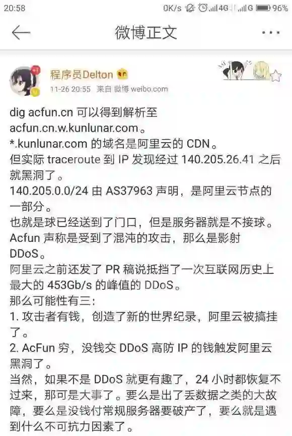 11月27日晚间,A站恢复了访问,有网络人士发现A站的DNS结构并没有发生变动,这很大程度上说明此次暂停服务并非来自DDoS攻击;而A站涉及敏感内容较多的论坛版块匿名版,更早些时候恢复了运营似乎也说明暂时关站并非来自政策的压力;知乎上也没有出现像前几次危机时那样的爆料贴。