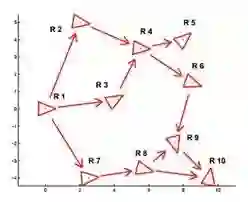 在这篇文章当中,我们提出,在不参考任何公共坐标系的情况下,通过一组机器人的相对位姿来评估其绝对位姿的方法。每个机器人都能够通过其邻近的机器人,来测量其相对与其他机器人的位置和朝向,但因为噪声的存在,这种测量方法并不是十分准确。这个方法的思路是,通过计算每个相关的机器人的位姿,来近似计算锚点的位置。具体步骤如下:首先计算每个机器人的相对方向,之后根据这些方向值,来更新其相对位置的测量值。如下图所示:10个机器人放在在一个平面环境中,并且处于未知的位置,每个机器人都可以测量其相对于其他机器人的位置和方向。