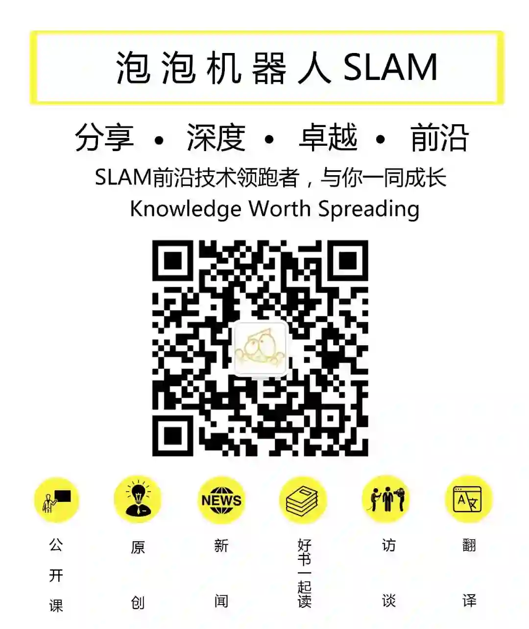 泡泡机器人SLAM的原创内容均由泡泡机器人的成员花费大量心血制作而成,希望大家珍惜我们的劳动成果,转载请务必注明出自【泡泡机器人SLAM】微信公众号,否则侵权必究!同时,我们也欢迎各位转载到自己的朋友圈,让更多的人能进入到SLAM这个领域中,让我们共同为推进中国的SLAM事业而努力!