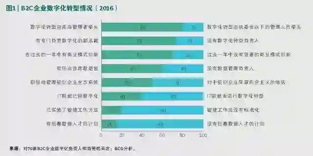 为了理解领先企业如何应对当前市场的变化和不确定性,BCG与IBM以及电子商务组织(Electronic Business Group,法国一家领先智库)合作,针对数字化转型的课题采访了70家B2C企业的高管(其中包括60家传统企业和10家纯数字化企业)。