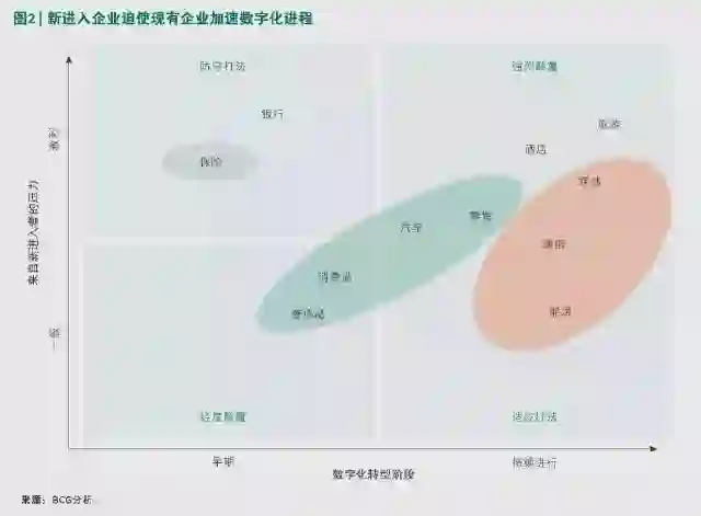 现在所有的行业都受到数字化的冲击,但是企业的应对之法各不相同,这取决于新进入者给它们各自带来多大的压力,以及数字化对其所在行业的影响程度(参阅图2)。在某些行业,比如酒店、零售和旅游行业,由于数字化初创公司在风险投资的资金支持下大量涌入,因此竞争相当激烈。而在银行和保险行业,由于某种程度上受到法律壁垒的保护,新进入者很难发展壮大,现有企业还可以采用防守打法。但是这些银行还是受到了金融科技企业带来的极大冲击,尤其是在支付领域。而在奢侈品和消费品领域,新进入者给现有企业带来了严峻挑战。在没有法律门槛保护的情况下,企业不得不快速适应新的竞争环境。多数现有企业的应对方法是定期四处搜寻新技术和专利,在入侵者变得太危险之前就将其收购。联合利华10亿美元收购美元剃须俱乐部(Dollar Shave Club)就是实施这一战略的突出案例。