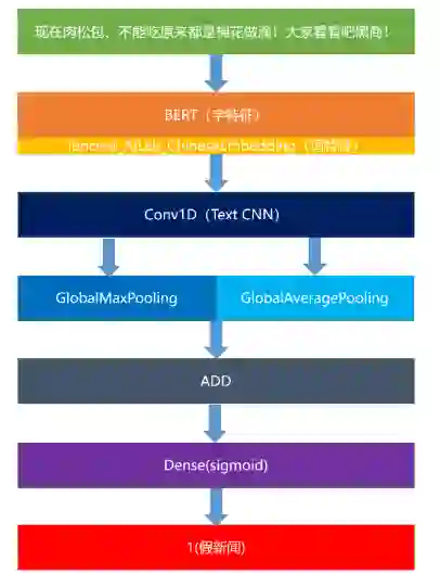 该模型采用BERT模型提取出字向量(不Finetune),然后结合腾讯词向量,作为最终的词向量输入到1维卷积网络中。在池化过程中同时选择最大池化和平均池化,最后将其结果相加,接入一个Dense层中得到结果。