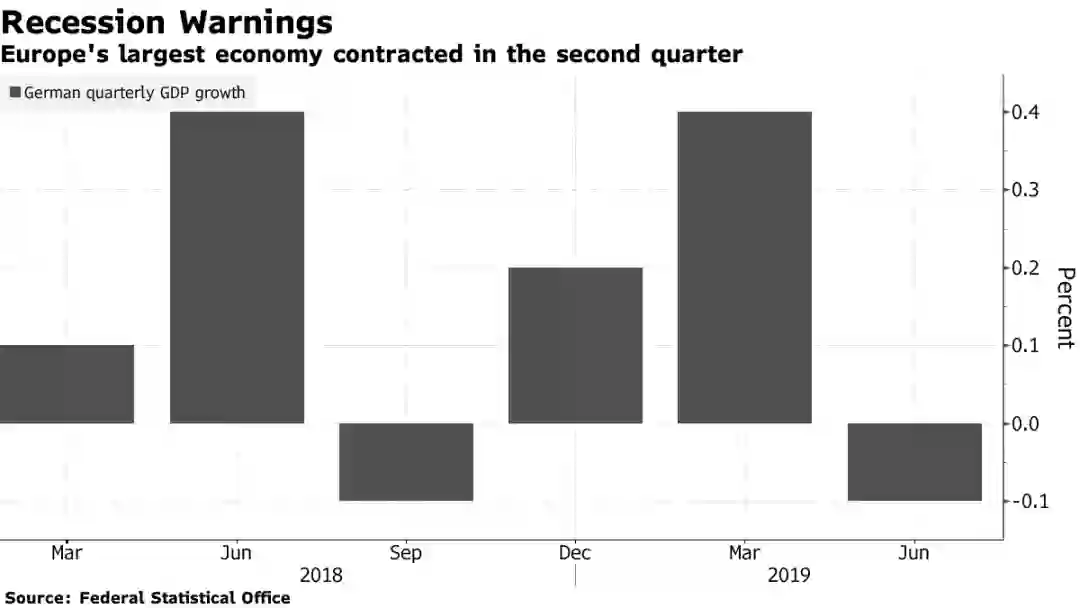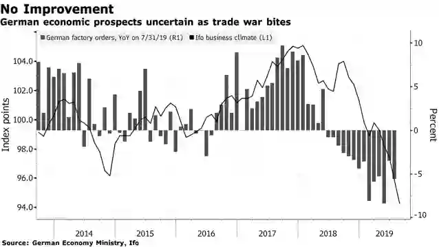 德国和欧元区采购经理人指数(PMI)显示,8月制造业进一步下滑,而且服务提供商也开始受到冲击的迹象与日俱增。但就德国而言,7月工厂订单下滑,从而加剧了将这一欧洲最大经济体推向衰退边缘的工业衰退:随着欧元区以外的订单锐减,需求较6月下滑了2.7%;6月数据为增长2.7%。